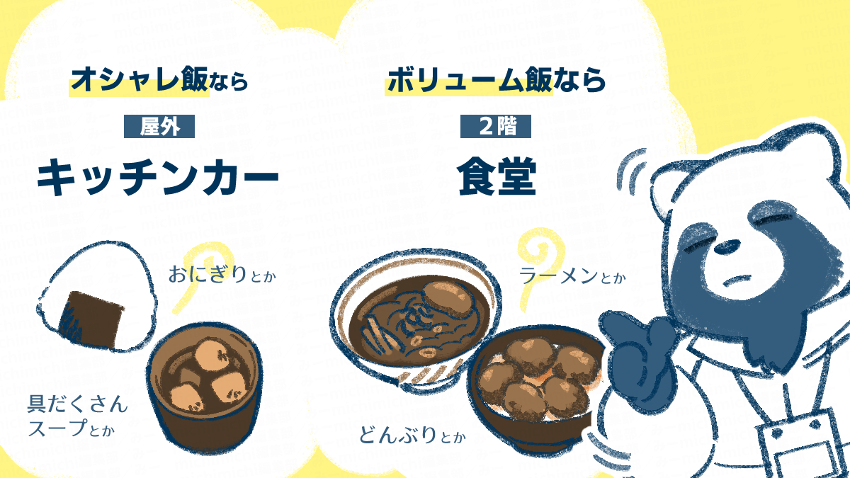 ごはんは2階/屋外で。例年どおりなら2階食堂はボリューム重視、屋外キッチンカーはオシャレ重視といった感じだ。
